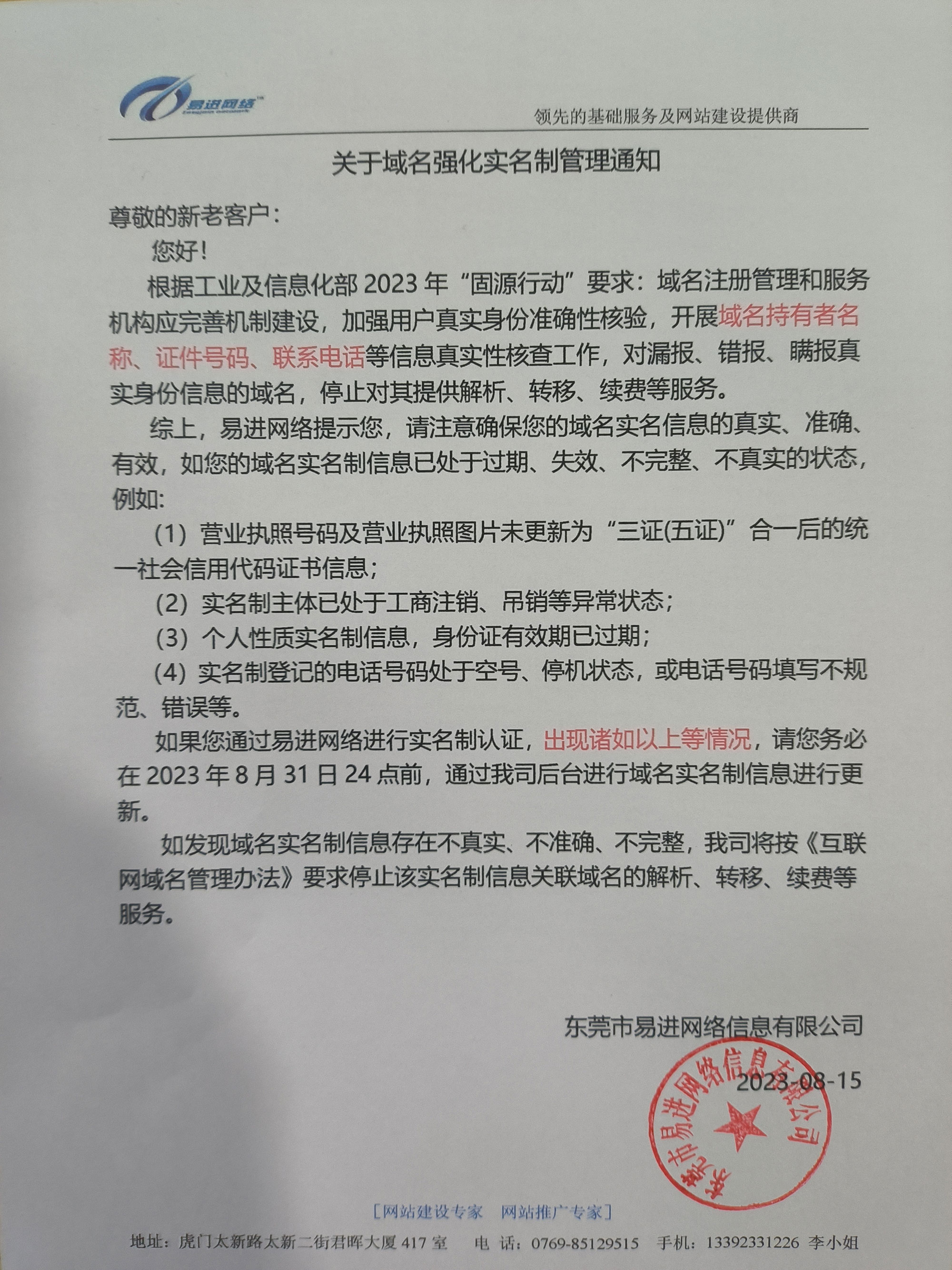 如果您通过易进网络进行实名制认证,出现诸如以上等情况,请您务必在2023年8月31日24点前,通过我司后台进行域名实名制信息进行更新。